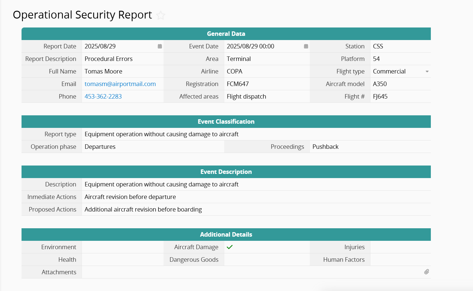 Each report includes general details such as date, location, description of incidents, department, damage to the aircraft, or injuries reported if the accident has already happened. The users can easily add images to their report by opening their camera from the upload image field in the form.