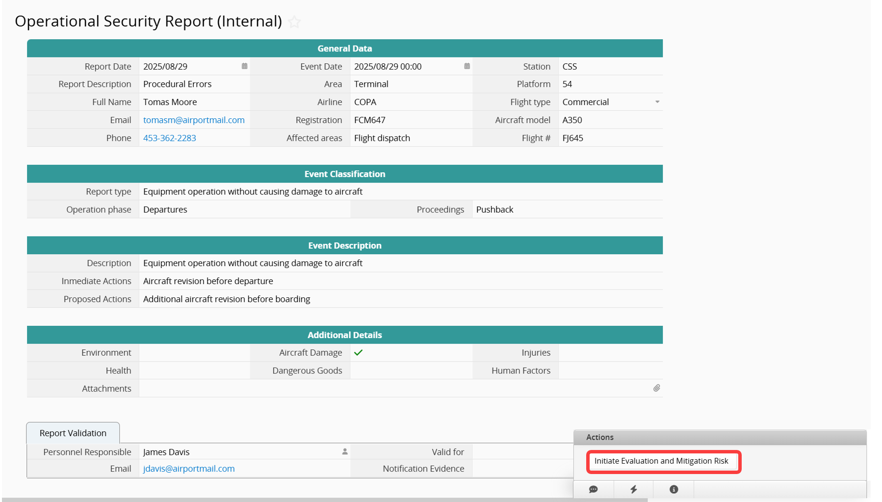 The risk management team reviews the report in a more elaborate version of the Operational Security Report Sheet. This is where they can validate the report, assign responsibilities, and notify the corresponding staff.
