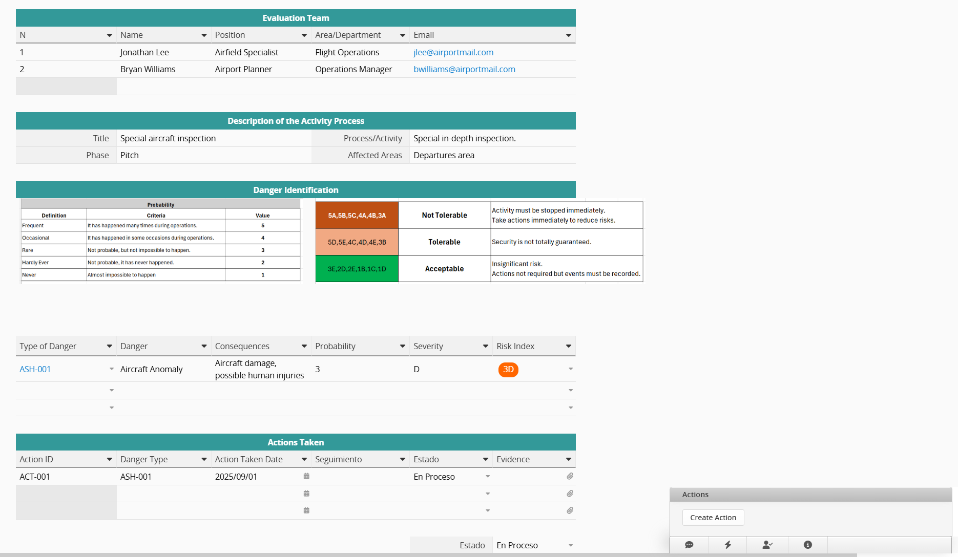 In this sheet, each "Action" record is linked to an Evaluation and Risk Mitigation ID. It includes the danger details, designated staff, and status as well as the Action process.
