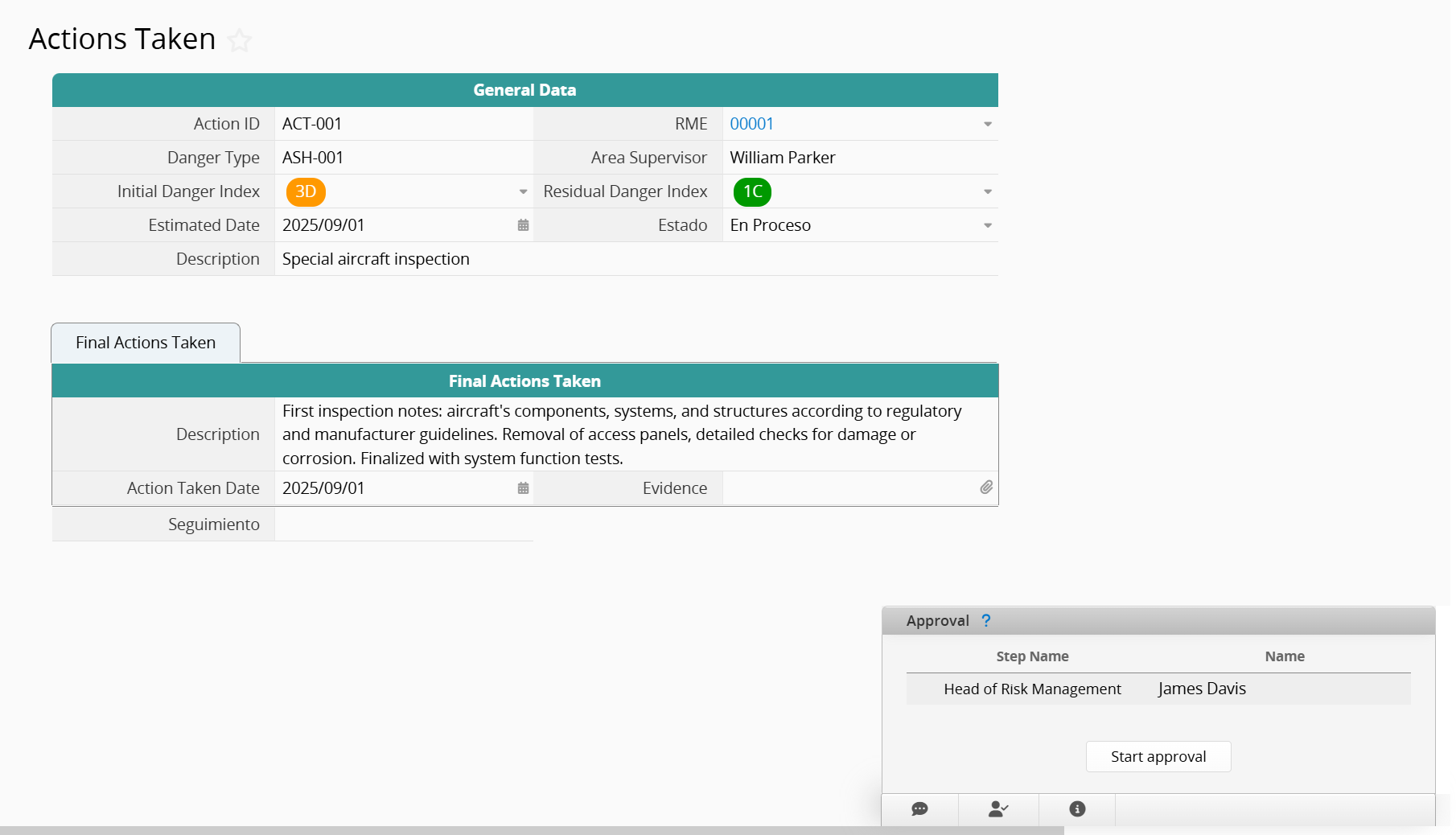 Using an action button, they can create records in the “Actions Taken” sheet to add further details to each action and to be approved individually.